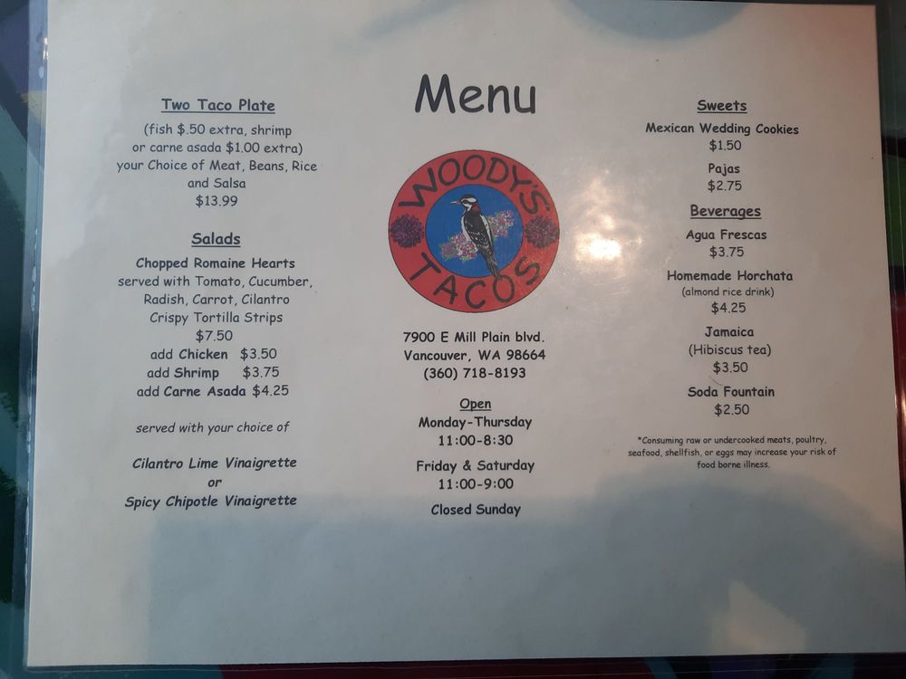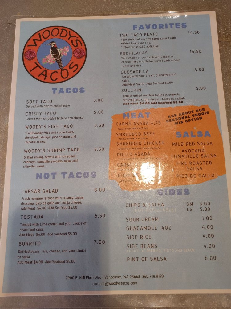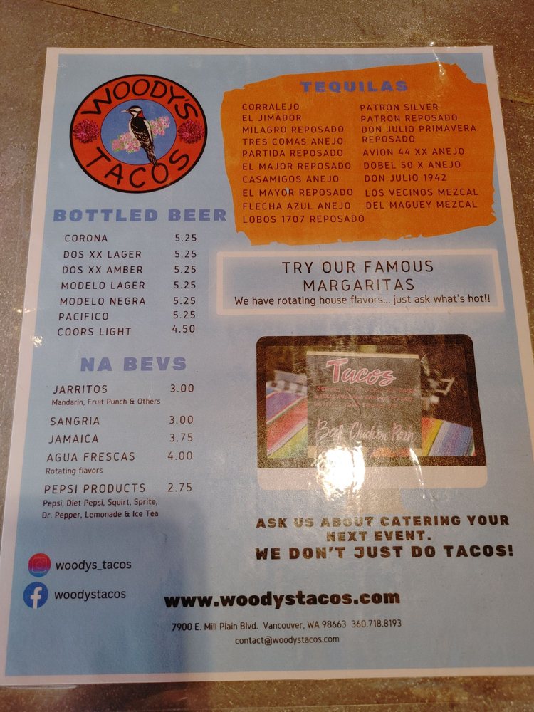 Woody's Tacos, located in Vancouver, WA, is a casual restaurant offering a variety of tacos with vegan options available. The menu includes traditional favorites like carne asada and al pastor, as well as unique creations like the BBQ jackfruit taco. With outdoor seating, a full bar, and free Wi-Fi, Woody's Tacos is a great spot for lunch or dinner. The restaurant is dog-friendly and perfect for group gatherings. The establishment also offers takeout, delivery, and accepts reservations, making it convenient for customers. Whether you're craving a classic taco or want to try something new, Woody's Tacos has something for everyone. Their welcoming atmosphere and diverse menu options make it a must-try dining destination.